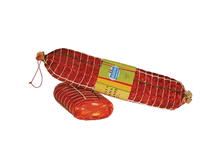 Salami produced with pork belly and ham from the EC, coarsely minced, salted, flavoured and stuffed into synthetic casings. The product is seasoned according to tradition in controlled environments, keeping it pressed between steel grids to ensure the typical shape and consistency. The salami is available in two versions, one classic sweet, the other spicy. The salami is available in different formats, packaged loose or vacuum-packed in compliance with current regulations.